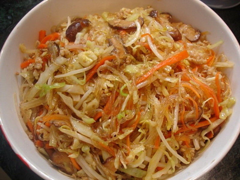 1. Soak glass noodles in room temperature water for 10 minutes. Drain, then cut into short pieces.