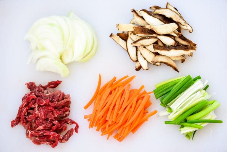 Clean all the ingredients. Cut the carrot into matchsticks. Thinly slice the onion. Run the knife through the white parts of the scallions lengthwise, if thick, and then cut into about 2-inch long pieces. Remove the stems from the mushrooms, and slice into 1/4-inch thin strips. Cut the meat into thin 2-inch long strips.